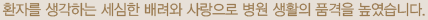 병원 생활의 정서적 안정감을 높이기 위해 모든 의료 환경을 환자 중심으로 구성하였습니다. 강남구립 행복요양병원은 언제나 병원의 중심에 환자가 설 수 있도록 더 나은 시설과 세심한 서비스로 환자중심 의료를 실현합니다.