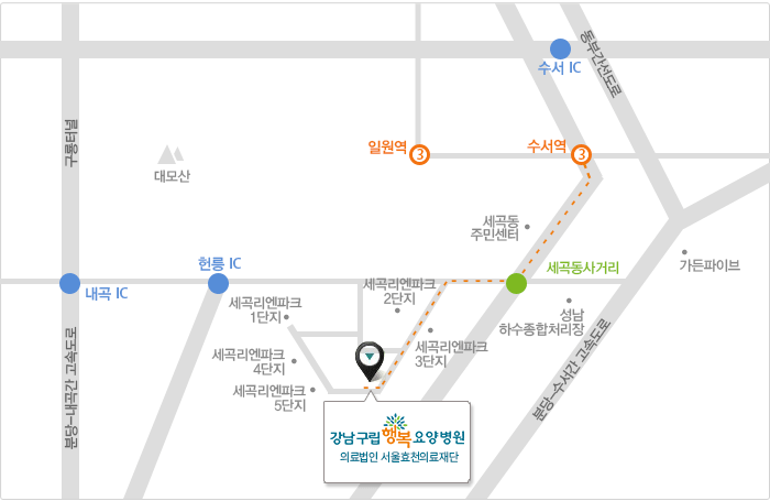 강남06-1(마을버스) 환승) 또는 강남06-2(마을버스) → 강남구립 행복요양병원 하차 강남 06(마을버스) 환승 → 은곡마을 하차 후 길 건너 700m도보 이용 2412(시내버스) 환승 → 은곡마을 하차 후 길 건너 700m도보 이용